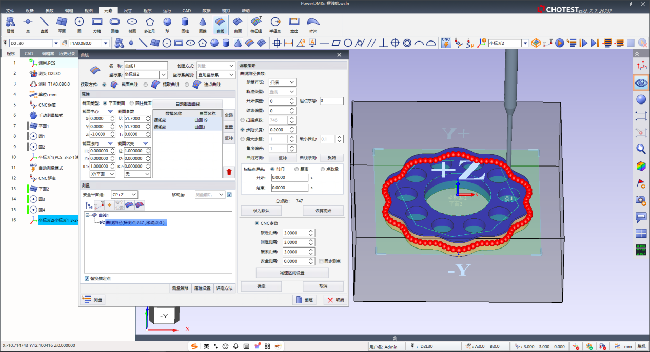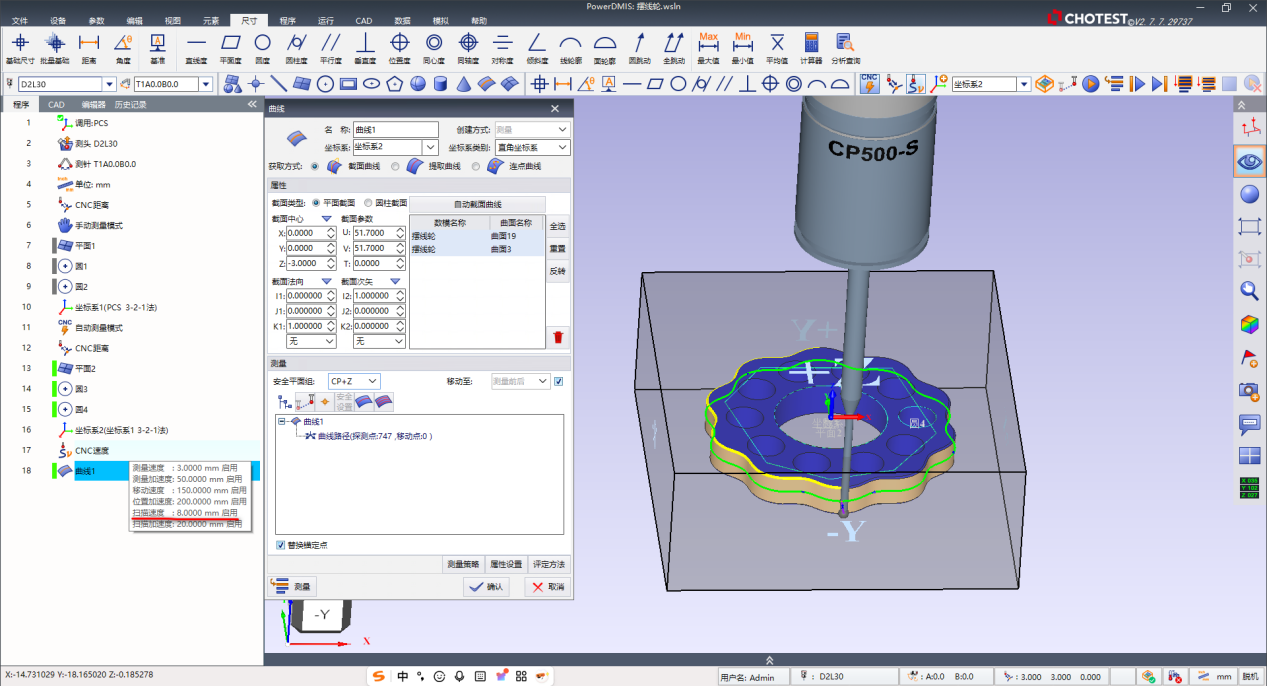 步骤3:本测量采用CP500S连续扫描测头,为确保数据质量,扫描速率恒定维持在8mm/s,速度过快将导致数据点失真。采集的数据通过PowerDMIS软件进行后续处理与分析(见下图)。