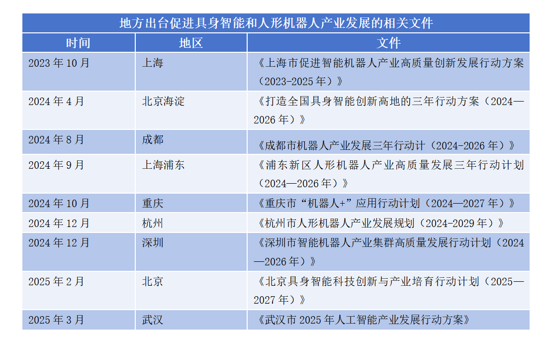 2023年以来,我国持续加大对人形机器人和具身智能产业的布局。工信部等部门先后发布《“机器人+”应用行动实施方案》和《人形机器人创新发展指导意见》,提出人形机器人有望成为颠覆性产品。2025年《政府工作报告》进一步将“具身智能”与“智能机器人”列为未来产业重点。为抢占产业制高点,北京、上海、深圳、杭州、成都等地纷纷出台专项政策,围绕技术攻关、产业培育、场景建设和生态构建全面发力。