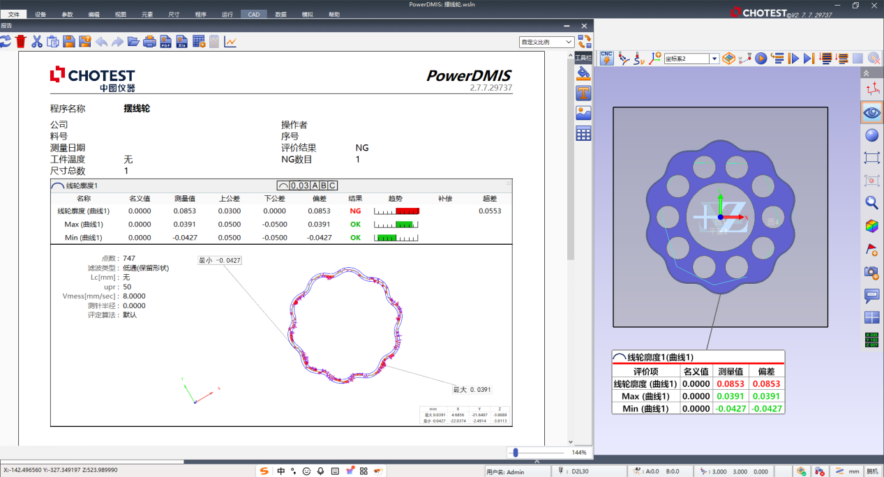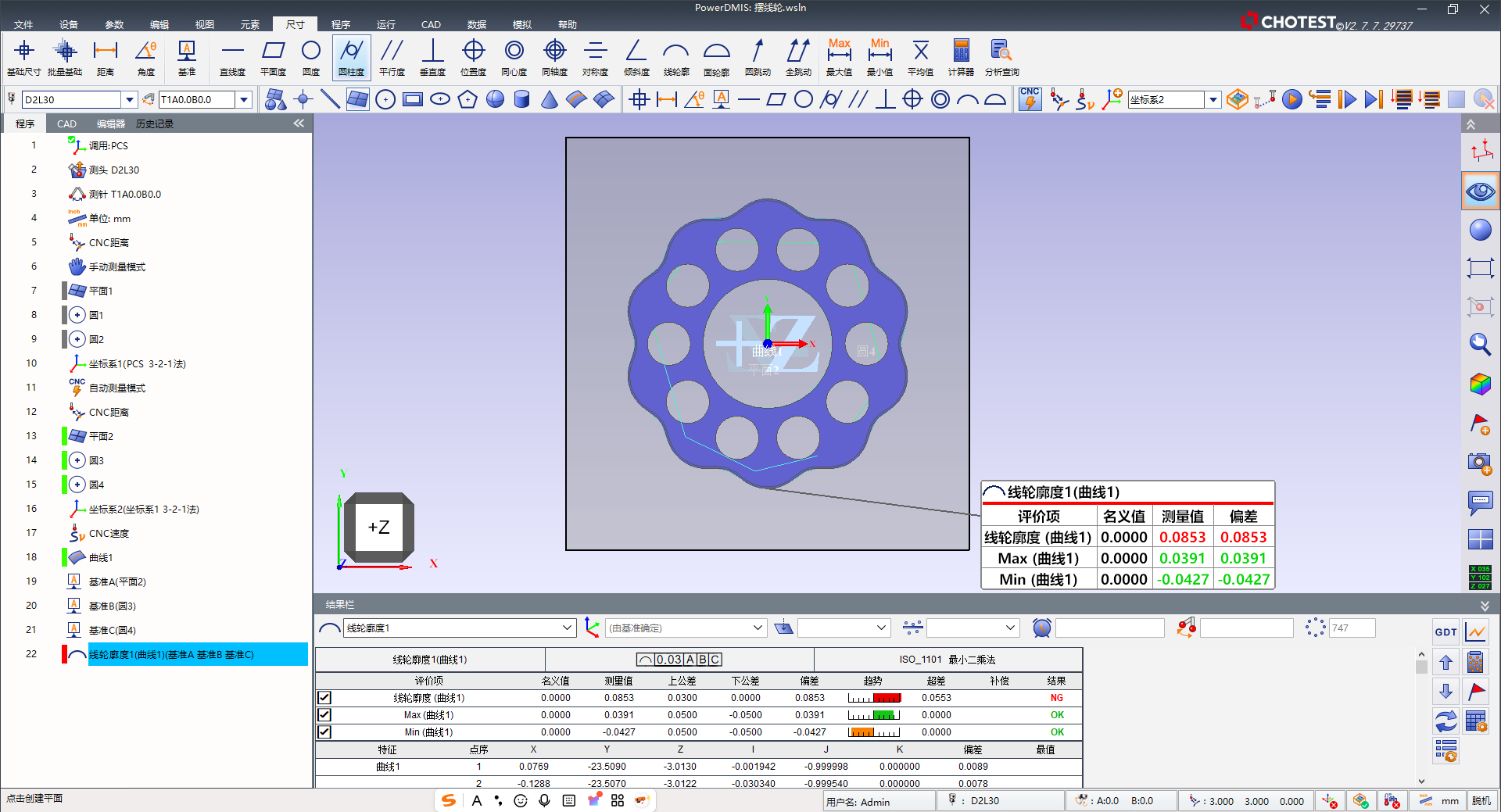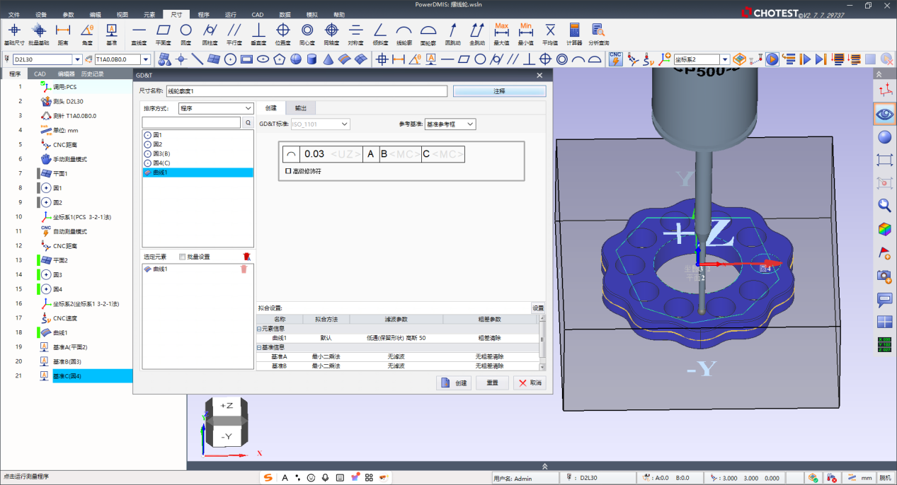 步骤4:PowerDMIS评价线轮廓度时,会在基准A、B、C建立的坐标系下,将实测轮廓与理论CAD轮廓进行最佳拟合对齐,并计算两者之间法向偏差极差的两倍作为最终误差并生成可视化报告。(如下图所示)。