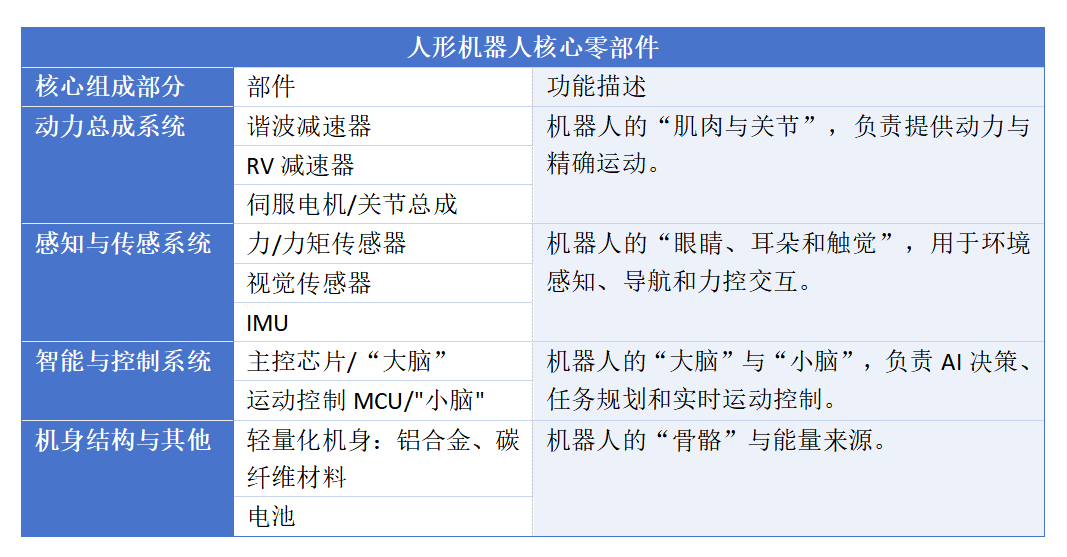 人形机器人的核心零部件,是支撑其实现精准、有力、柔顺运动的基石。具体如下图所示: